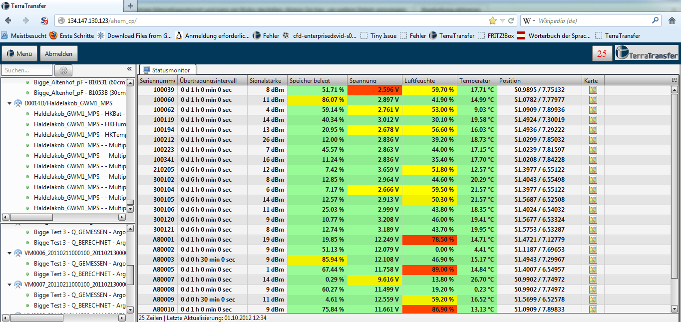 Intuitiver Überblick über den Gerätezustand mit Ampelfarben, Batteriestatus; letzte Übertragung; Temperatur und Luftfeuchte im Gehäuse; Signalstärke